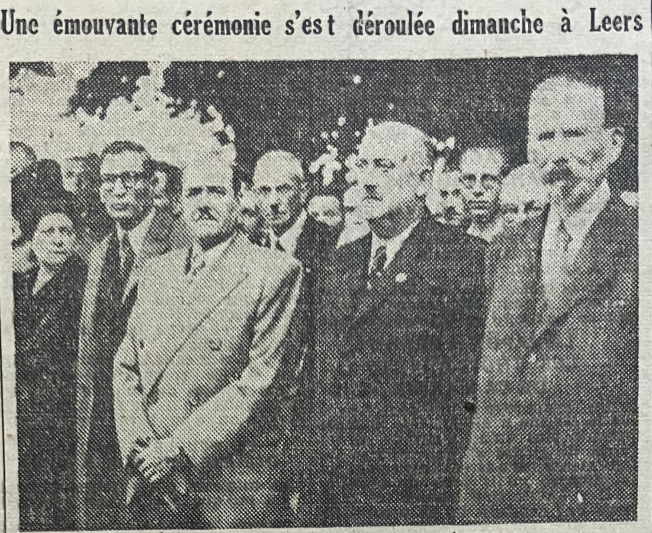 Le dimanche 19 août, une émouvante manifestation se déroule à Leers où plus de 3000 personnes venues de toutes les communes environnantes se sont rassemblées en cortège derrière la clique Les Volontaires de Leers et la Fanfare La Paix de Roubaix. Les drapeaux d’une trentaine de sections flottent en tête du défilé. Parmi les personnalités, on reconnaît Augustin Laurent ancien ministre des PTT, A. Van Wolput, Just Evrard, Émilienne Moreau membres de l’assemblée consultative, Victor Provo maire de Roubaix, Marcel Guislain président de l’association des déportés, Camille Delabre et René Coquerel compagnons de captivité de Léon Wolf, A. Delebecque, secrétaire administratif de Nord Matin, le docteur Léandre Dupré, M. Dequenne maire de Flers, Lepoutre de Libé-Sud et le conseil d’administration de la caisse d’épargne sociale Le Travail.