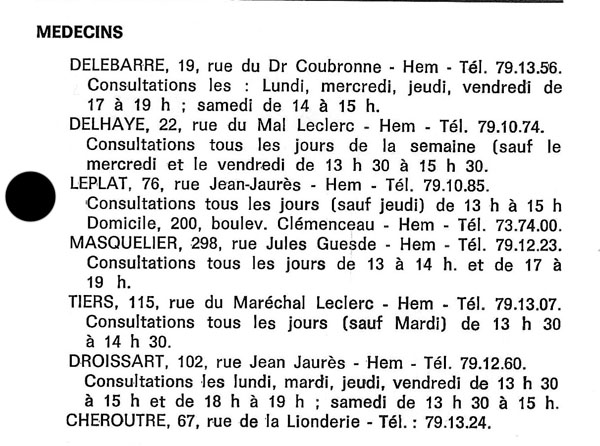 La fin de la décennie 1960 voit également adoptés différents projets par le conseil municipal de Jean Leplat : un club de jeunes aux Trois Fermes, l’inauguration d’une rue du Docteur Leborgne en hommage au médecin hémois fondateur du dispensaire d’hygiène social et la dissolution du corps des sapeurs pompiers de la ville suite à la réorganisation complète du service d’incendie de la communauté urbaine (sur ce sujet voir un précédent article intitulé Les pompiers à Hem), la construction de dominos avenue Foch et enfin la construction d’un nouveau bureau de poste (sur ce sujet voir un précédent article intitulé La Poste à Hem).