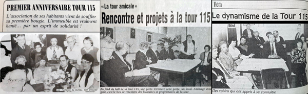 Pendant ce temps à la tour 115, à deux pas de la Piscine des 3 Villes, l’atmosphère est toujours à l’entraide et la cordialité en partie grâce à l’association des habitants. Des animations ont lieu une fois par mois, et un local de rencontre y est réservé aux habitants de la tour, aménagé à leur goût. Sont également organisés des sorties et banquets permettant de souder les résidents, propriétaires comme locataires.