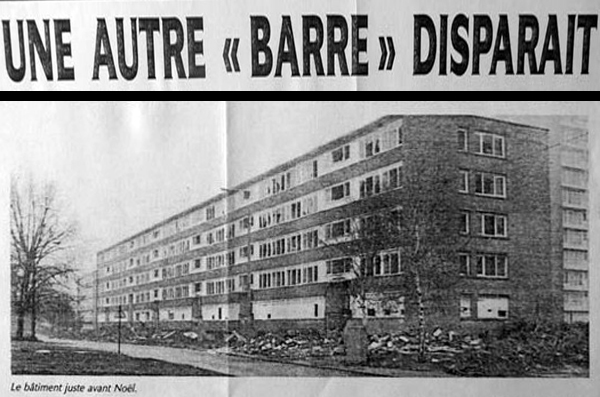 En décembre 1990, le Fleming, rue Alexander Fleming, bloc de 60 appartements atteint depuis 3 ans le seuil critique de 50% d’appartements inoccupés et devient même un facteur de nuisance pour les environs. Les familles nombreuses préfèrent à présent être logées dans des maisons individuelles en location plutôt que dans les barres d’immeubles construites en masse dans les années 60. La presse locale titre : une autre barre disparaît, en référence à la grande barre démolie 5 ans plus tôt suivie de la petite barre, dans le quartier des Hauts-Champs (sur ce sujet voir un précédent article édité sur notre site).