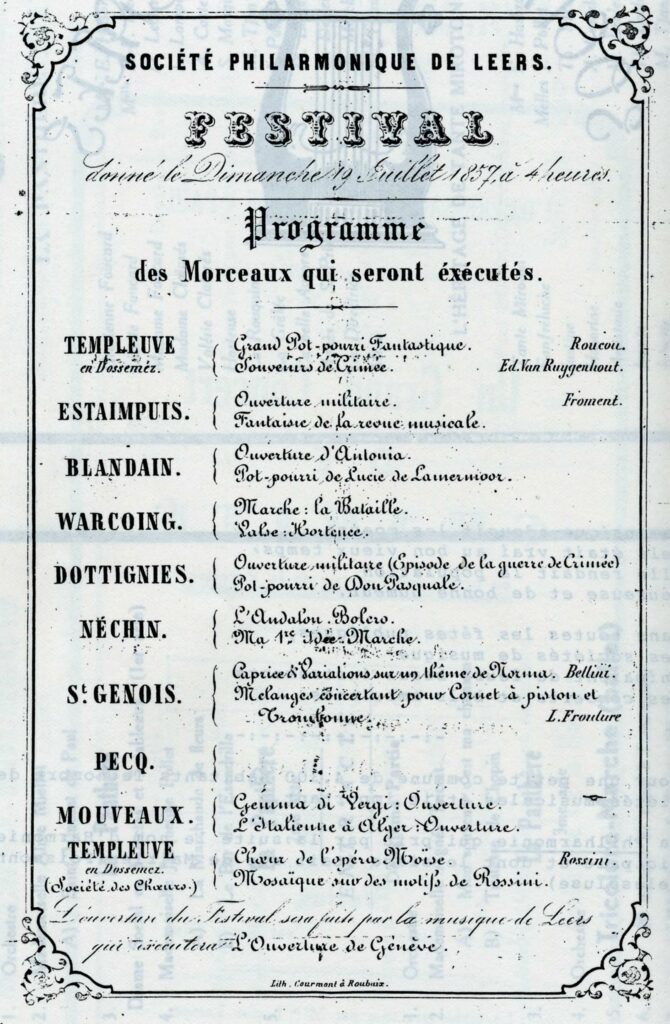 Le 19 juillet 1857, la société leersoise organise un festival de musique dont elle fera l’ouverture, avec la participation de nombreuses sociétés de musique. Le 13 août 1867, elle participe aux fêtes d’inauguration des Eaux de la Lys à Roubaix.