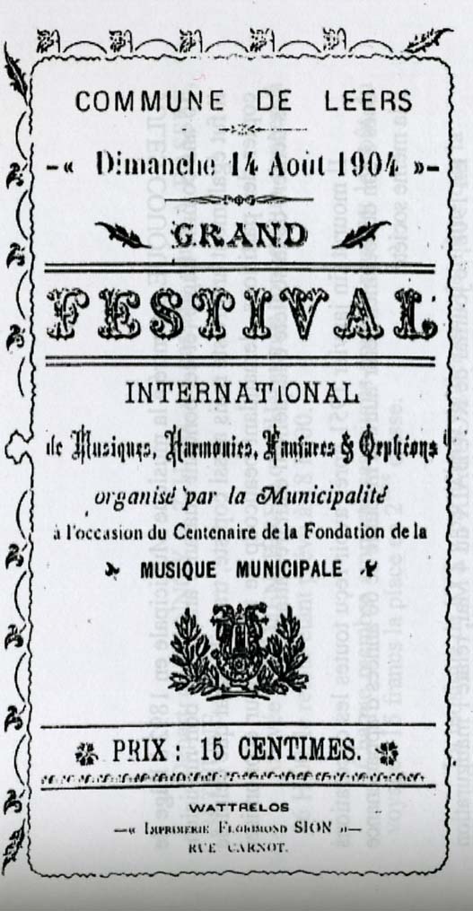 Pour son centenaire en 1904, la société municipale organise un grand festival international de musique le 14 août. Cinquante six sociétés sont affectées aux différents quartiers de Leers. La musique municipale ouvre les festivités avec la Marseillaise et une composition pour l’occasion intitulée le Centenaire. Elle comptait alors 45 exécutants et son directeur était M. Drieu.