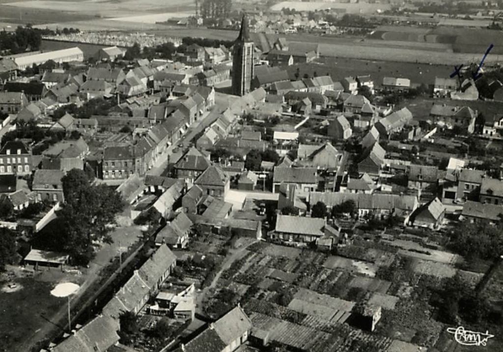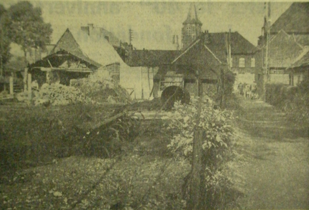 En 1963, il est décidé de construire une route reliant la rue Roger-Salengro (ex rue de la Papinerie) à la rue des Patriotes. Mais pour cela, il est nécessaire de démolir une partie de la ferme de Monsieur Lampe, qui doit être diminuée de quinze mètres sur toute sa longueur. Cette vieille cense dont le portail date de 1815, doit être amputée de sa grange qui est plus ancienne puisqu’elle remonte au 17eme siècle, comme d’ailleurs tous les autres bâtiments. Les travaux devraient commencer à l’hiver 1964, afin que la route soit ouverte à la fin de l’été. Sur la photo aérienne ci-dessus, on peut apercevoir la ferme Lampe au bout de la rue des Patriotes et en bas à gauche l’arrivée de la rue Salengro.