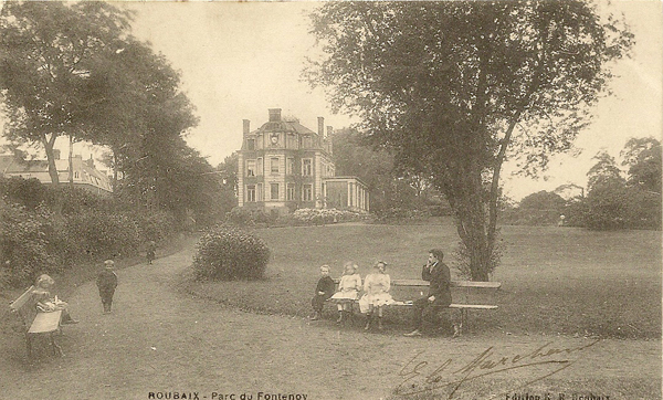 Le square Wibaux, autrefois appelé « Parc du Fontenoy », se situe dans la rue de Cassel à Roubaix. Il doit son nom au château se trouvant dans cette rue, propriété de la famille Wibaux. Sur la photo ci-dessous, on distingue parfaitement le château au fond du parc, sur la gauche la rue de Cassel et l’intersection de la rue du Fontenoy qui se trouve juste en face de la demeure.