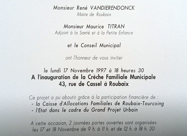 En 1997, la crèche familiale municipale de la rue de Cassel est rénovée. Elle est inaugurée le 17 Novembre à 18h en présence de Mr le Maire René Vandierendonck et du médecin pédiatre Maurice Titran. La directrice Mme Messien, les responsables et assistantes maternelles organisent alors une opération Portes Ouvertes les 17 et 18 Novembre 1997 pour la visite des locaux.