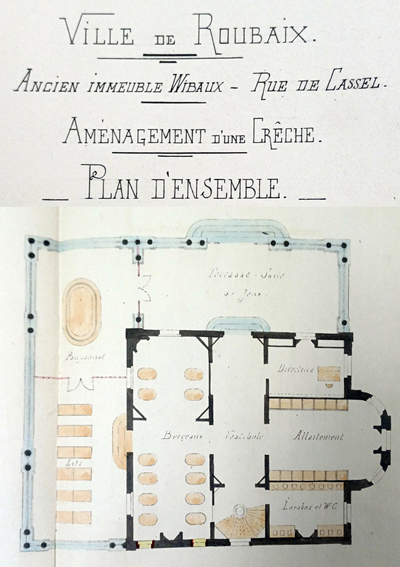 Sur la droite de la construction ( à la place du château Wibaux ), est édifiée la nouvelle crèche qui accueille les mères de famille dans différentes salles ; admission, allaitement, lingerie, biberonnerie, cuisine, dortoirs, réfectoire, salle de jeux, jardin et même une « halte d’enfant » qui prend en charge les enfants de mères de famille contraintes de s’absenter un moment.