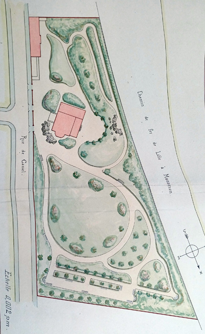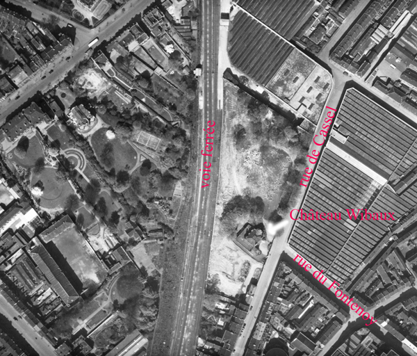 Sur la photo aérienne ci-dessous, prise en 1953, on distingue parfaitement le parc, le château Wibaux, la rue de Cassel et la voie ferrée.