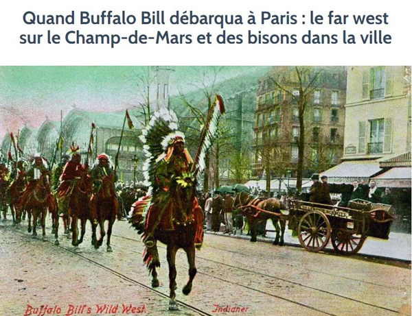 Après la guerre de sécession, Buffalo Bill décide d’organiser un spectacle populaire, le « Buffalo Bill’s Wild West ». En 1889, il est de passage à Paris pour l’Exposition Universelle et transforme la Ville lumière en un décor de western grandeur nature, avec des cavalcades endiablées, des bisons en cavale, des indiens à cheval et des coups de feu en ville.