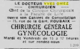 Yves Omez naît en 1914. Il poursuit ses études à la faculté de médecine à Lille. En 1939, il publie une thèse pour le doctorat en médecine : une étude clinique sur le sarcome de l’intestin grêle. Il est chef de clinique à la faculté de Lille et en 1941, il devient chirurgien spécialisé en gynécologie et ouvre son cabinet de consultation au 75 rue de la Gare à Roubaix.