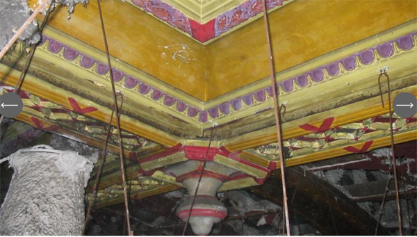 Dans le hall, des colonnes impsantes soutiennent le plafond de couleur ocre et rouge, de style orientaliste et moderne.