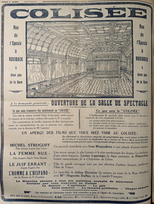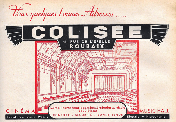 La salle de cinéma est dotée d’un parterre et de balcons, des bars permettent au public de boire une consommation pendant l’entracte. Jean dirige les deux établissements : le Fresnoy qui est un lieu de distraction populaire, et le Colisée qui s’adresse à la bonne société de Roubaix-Tourcoing