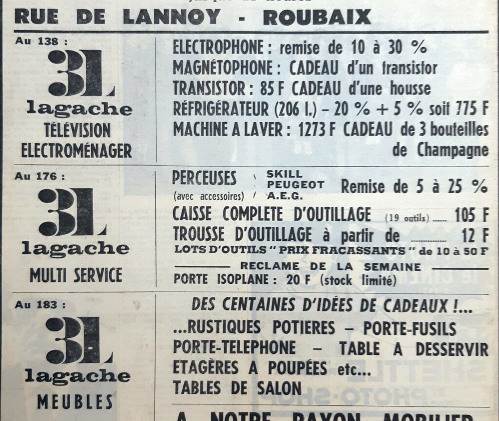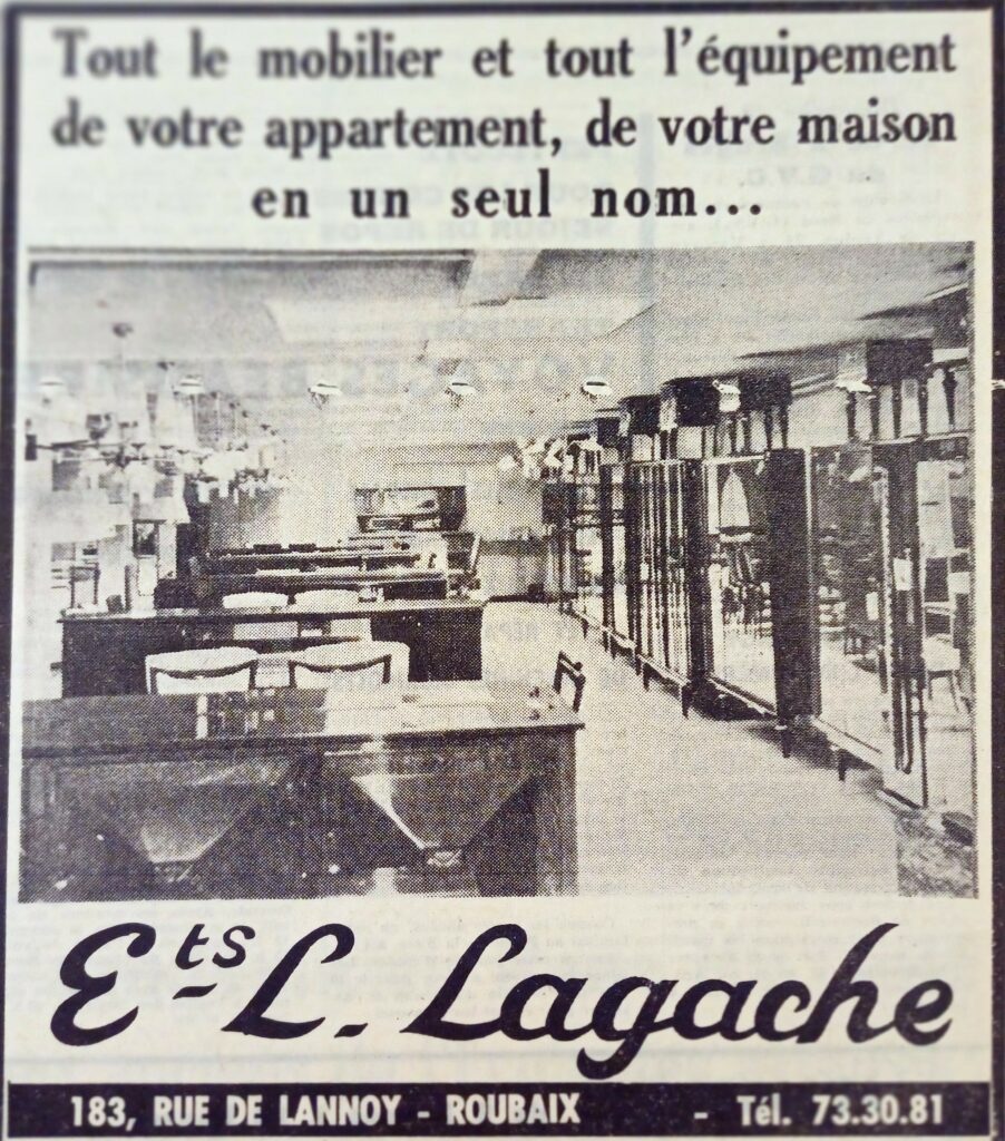 Lucien et Lucette Lagache continuent de développer leur entreprise, ils reprennent également la maison voisine du premier magasin, au 185 de la rue de Lannoy, autrefois occupée par la librairie de Mme Vve Vergote, et ceci dans le but d’agrandir l’établissement. Ils organisent alors, une vente avec des remises de 30% sur tout le magasin, pour liquider les stocks avant travaux.
