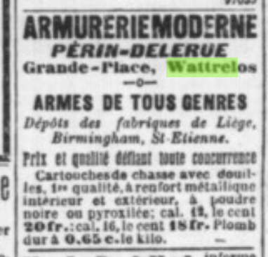 Tir. À Roubaix, estaminet de la Cloche rue Neuve grand tir aux pigeons. La société de tir les Amis de la Cible siège estaminet de la ville d’Antoing à Roubaix joue les prix du mois. À Wattrelos, 81 tireurs se sont donnés rendez-vous chez M. Périn Delerue, armurier, (arrêt du car électrique, Terminus), pour un important tir aux pigeons.