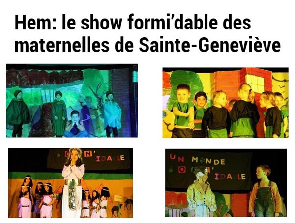 Par la suite la kermesse annuelle a lieu à la salle des fête de Hem, notamment celle de 2016 qui enthousiasme la presse locale, à laquelle assiste près de 300 personnes. La voix du Nord titre : le Show formi’dable des maternelles de Sainte-Geneviève. Les enfants font le show pendant 3 heures sur le thème de la découverte du monde de la science : décor de pyramides fait main, vaisseau spatial grandeur nature et multitude de costumes, ravissent l’assistance.