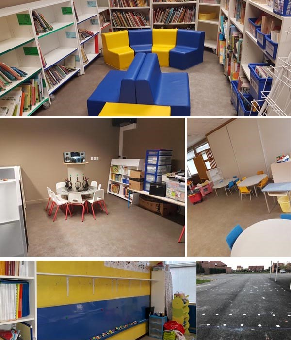 Puis l’école installe une bibliothèque en 2017 avec un coin écoute, un coin lecture et un coin informatique. Une garderie est également aménagée de façon à accueillir confortablement les enfants en dehors des heures de classe. Les parents bricoleurs se chargent d’installer des étagères de rangement. Par ailleurs l’extérieur n’est pas oublié et la cour voit se réaliser des marquages pour aider les enfants à se ranger.