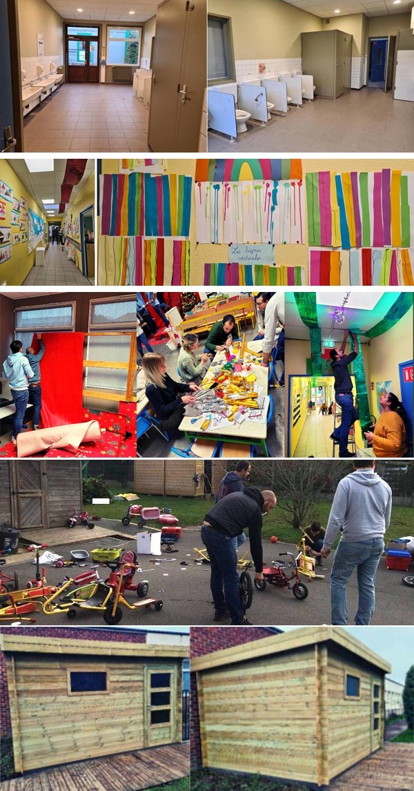 A l’intérieur de l’école les parents bricoleurs continuent à faire des merveilles. C’est la décennie de la réfection des toilettes, de l’installation de leds et de faux plafonds. Les enfants sont mis à contribution pour la décoration des couloirs. A l’extérieur, un nouvel interphone et installé ainsi qu’un crochet pour le portail. Les parents s’attaquent aussi à la réparation des vélos qui trouveront ensuite leur place dans un chalet de rangement.
