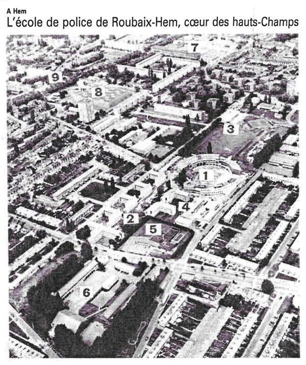 En effet, une école de police d’une importance considérable est inaugurée en 1993, construite sur un terrain de 6 hectares à l’emplacement des deux anciennes barres, en partie sur Roubaix et Hem. Sa partie circulaire est destinée à accueillir l’administration, l’enseignement et le restaurant tandis que 7 bâtiments sont réservés à l’hébergement du personnel et des élèves. Le terrain, qui s’étend finalement jusqu’à l’avenue Laennec abrite également un stade et une salle des sports et un stand de tir, destinés à l’entraînement des futurs gardiens de la paix. (sur le sujet de l’école de police voir un précédent article édité sur notre site)