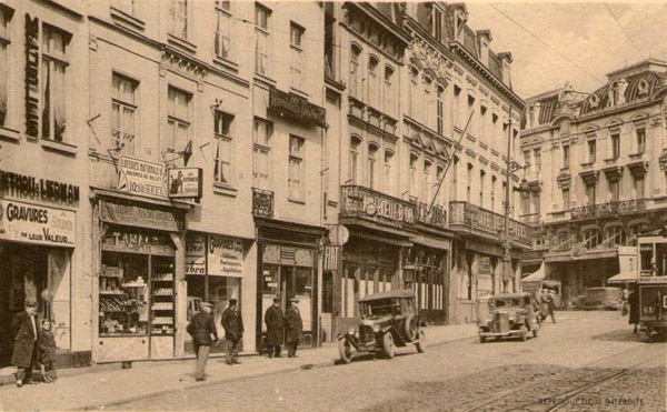 La photo suivante, prise aux environs de 1908, nous montre ce carrefour qui marque pratiquement la fin de la zone commerçante dans la rue. A gauche, l’estaminet l’Epi d’Or, et à droite, la pharmacie, sous la houlette respectivement de J Boucherie et de H. Delporte, qui officieront jusqu’au milieu des années 30. La quincaillerie Nivesse Carlier aura au 114 un destin plus éphémère : d’autres types de commerces s’y succèderont.