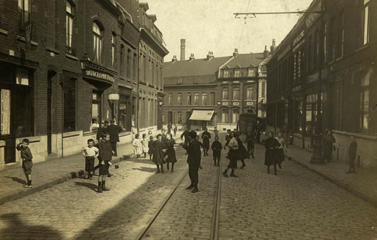 La ligne continue ensuite en voie unique et toujours en rampe, jusqu’au point culminant au carrefour des rues de Hem et Dammartin. La photo suivante, prise dans le sens de la descente, nous montre, au fond, le carrefour avec la rue Ma Campagne. Les enfants ont trouvé un terrain de jeu devant chez le photographe J.Bauchart dont on voit le magasin au 122 sur la gauche.