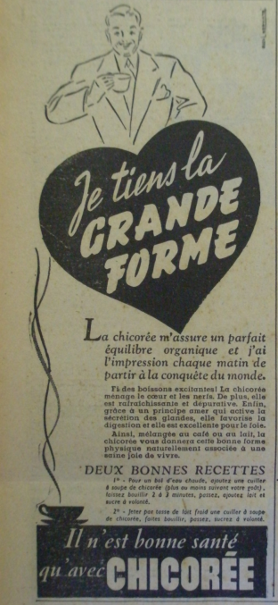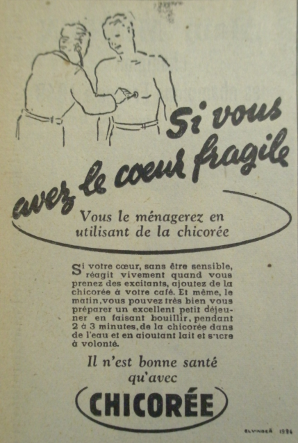 Selon cette campagne publicitaire de l’année 1950, la chicorée intéresse le cœur et les nerfs, le foie et les glandes. Et c’est aussi un excellent petit déjeuner.