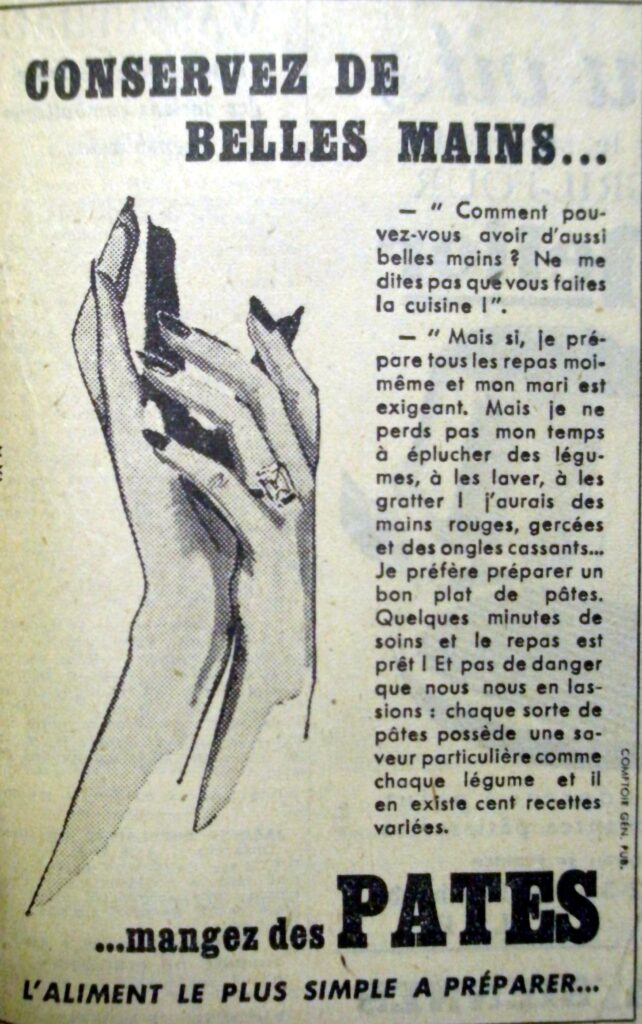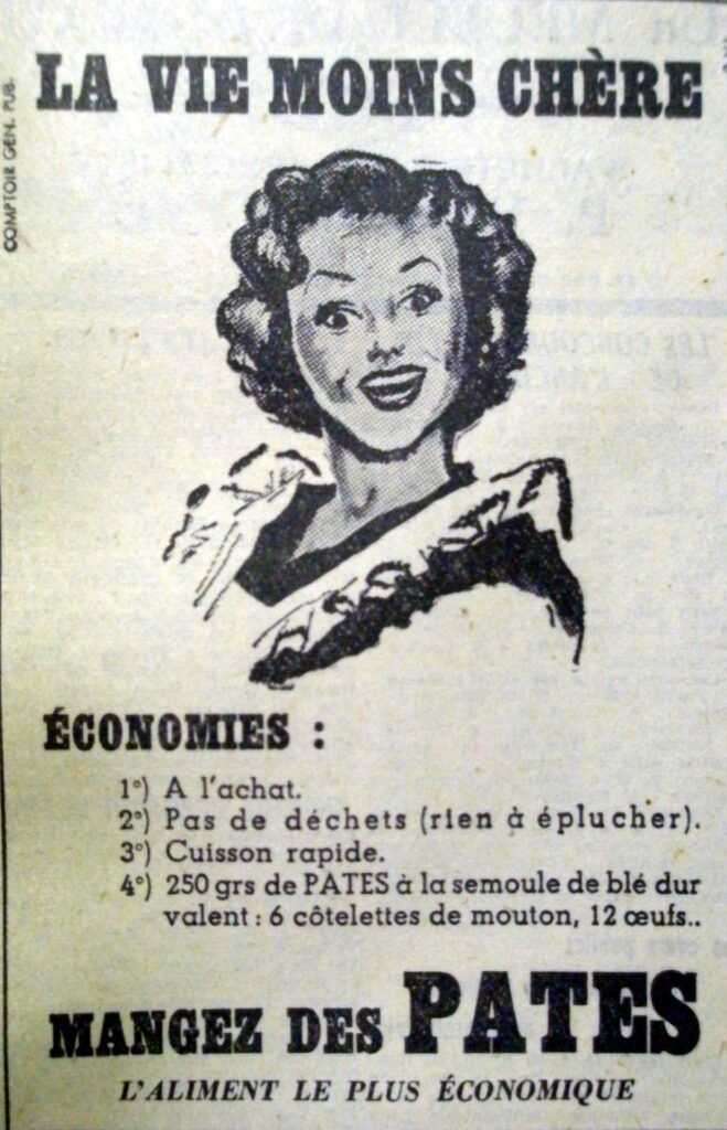 Bien que la seconde guerre soit terminée depuis quelques années, la période de crise qui a suivi a été longue et très dure : on manquait de tout et le ravitaillement vient à peine de disparaître. Les pâtes sont présentées comme l’aliment le plus économique. Leur prix est abordable. On gagne du temps car il n’y a pas de déchets ni d’épluchures (pommes de terre et légumes). La cuisson est rapide, on ne mijote pas trop. Et l’apport nutritif est important : 250 grammes de pâtes à la semoule de blé dur valent 6 côtelettes de mouton, 12 œufs ! L’accent est mis sur l’économie : produit abordable, gain de temps pour la préparation et la cuisson, économie à l’achat comparativement à d’autres produits.