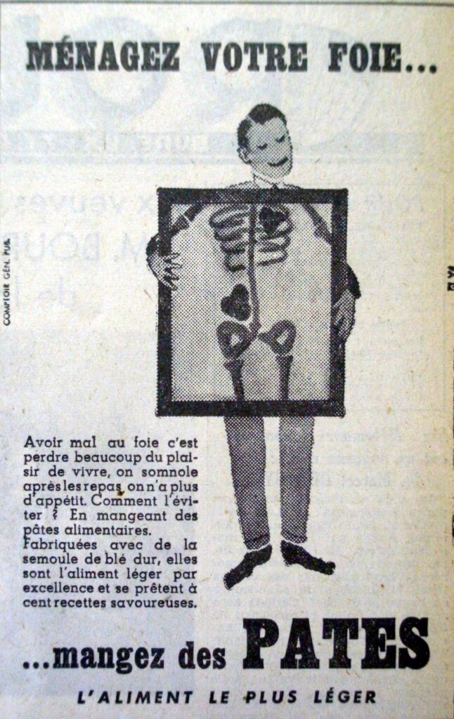Cette campagne publicitaire « Mangez des pâtes » démarre en janvier 1952 dans les journaux pour quelques semaines. Les français ont-ils suffisamment inscrit les pâtes dans leurs menus quotidiens ? Les pâtes sont-elles un produit de consommation courante à l’époque ? Elles seraient encore vendues au poids chez certains épiciers. Certes, il existe des marques mais elles sont peu ou pas connues. D’où l’idée d’une campagne en faveur des pâtes.